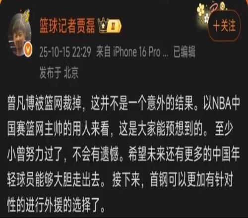 现在摆在曾凡博面前的有两条路,一是继续留在美国打发展联盟,继续寻找冲击NBA的机会;二是重返CBA打球。如果曾凡博选择打发展联盟的话,年薪方面比较低,而且能否获得进入NBA的机会也无法确定,有太多打发展联盟的球员不得不最终放弃NBA梦想。如果选择重返CBA打球的话,结合曾凡博的年龄来看,他基本上就无法再次冲击NBA了。对此北京记者贾磊在社交媒体上透露了他从北京男篮方面得到的最新消息,他表示从曾凡博的表现以及篮网主教练的用人来看,曾凡博被裁并不意外,“接下来,首钢可以更加有正针对性的进行外援的选择了。”