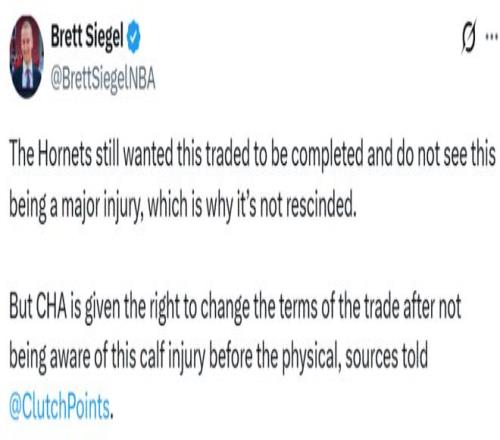 名记Siegel报道称,黄蜂队仍然希望完成这笔交易,并且认为这不是重大伤病,所以交易没有被撤销。