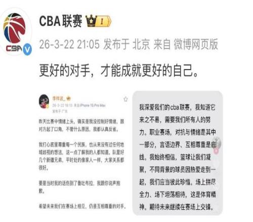 CBA官方转发了两个当事人的社媒回应并写道:“更好的对手,才能成就更好的自己。”